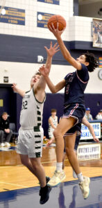 - Chautauqua Lake’s Joey Abuhmeidan skies for a layup as Brocton’s Owen Pryll defends during the consolation game of the Frewsburg Holiday Tournament on Saturday in Frewsburg. P-J photo by Matt Spielman