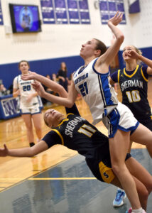 - Westfield’s Olivia Wolfe drives through Sherman’s Emmersen Crawford for a layup attempt during CCAA Division 2 action in Westfield on Thursday. P-J photo by Matt Spielman