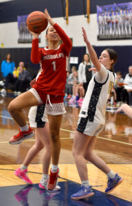 - Frewsburg’s Elysse Gruber scores on a breakaway against Randolph during CCAA Division 3 girls basketball Tuesday in Frewsburg. P-J photo by Matt Spielman