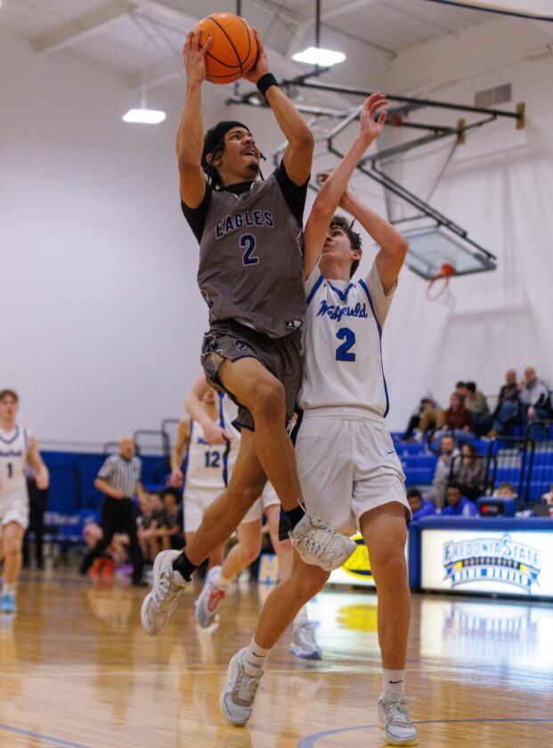 Brayden Paddock then hit 3-pointers on back-to-back Westfield possessions to make it a 51-46 game with 4:16 remaining. But Collins eventually tied the game at 55-all with 2:11 remaining and then put down a dunk right around the two-minute mark to give the Eagles a 57-55 lead.