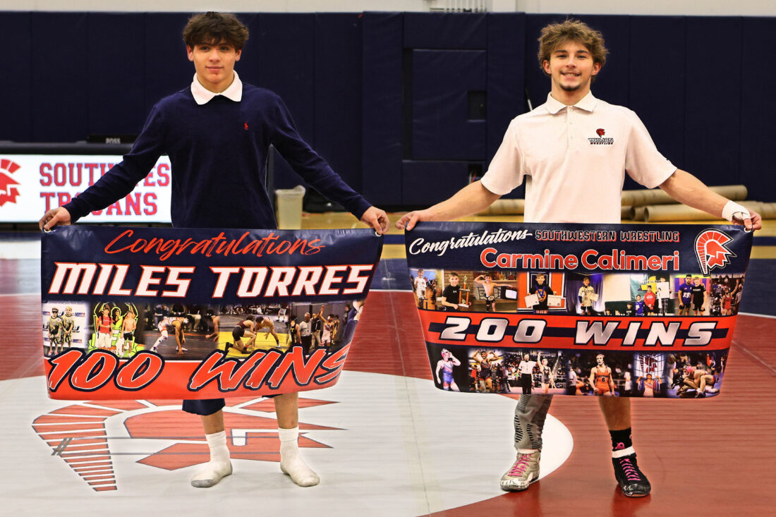 - Southwestern’s Miles Torres, left, was honored for his 100th career win, and teammate Carmine Calimeri, right, was honored for his upcoming 200th career win prior to the Trojans’ CCAA Division 1 wrestling match against Falconer/Cassadaga Valley on Wednesday in West Ellicott. Photo courtesy of Steve Garvey
