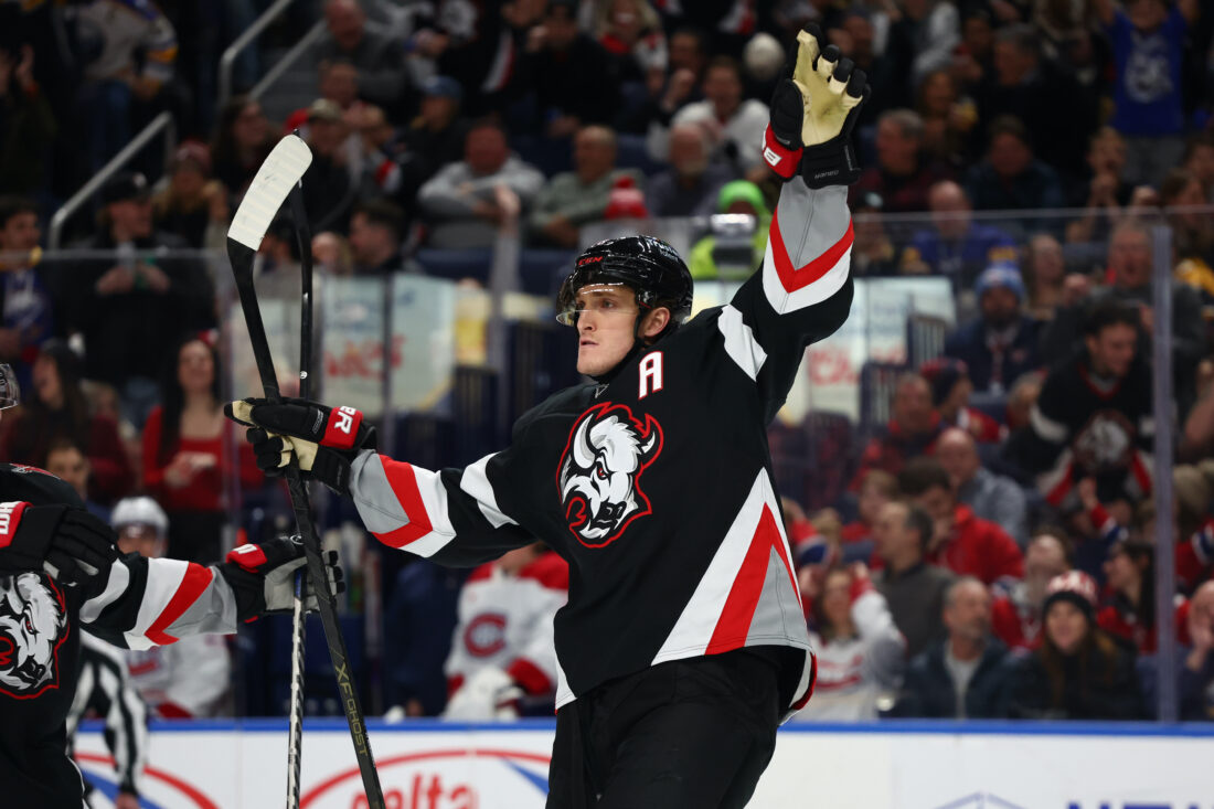 Buffalo Sabres center Tage Thompson celebrates his goal during the first period against the Montreal Canadiens on Thursday in Buffalo. AP photo