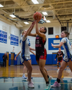 Westfield’s Reagan Weingart goes for a layup ahead of Maple Grove’s Meg Ryan during CCAA Division 2 girls basketball action Tuesday night in Westfield. P-J photo by Jason Bower