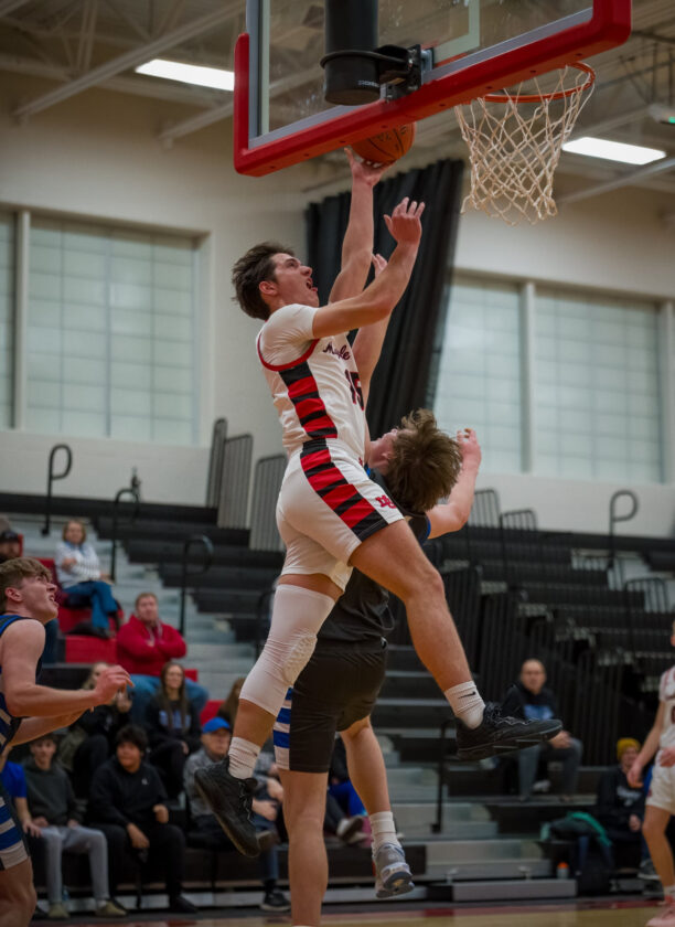 - Maple Grove’s Liam Colburn goes up for a basket over Westfield’s Grant Beadle during CCAA Division 2 action Monday. P-J photo by Jason Bower