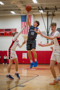 - Westfield’s Braylon Swanson floats a shot between two Maple Grove defenders. P-J photo by Jason Bower
