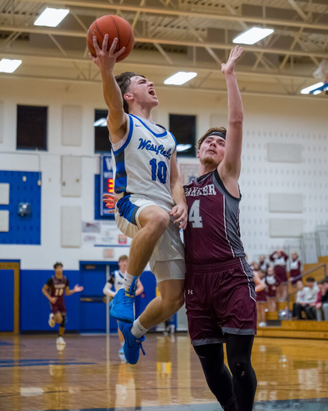 - Westfield’s Braylon Swanson scores through contact during the Wolverines’ Section VI Class C boys basketball quarterfinal against Barker on Thursday in Westfield. P-J photo by Jason Bower