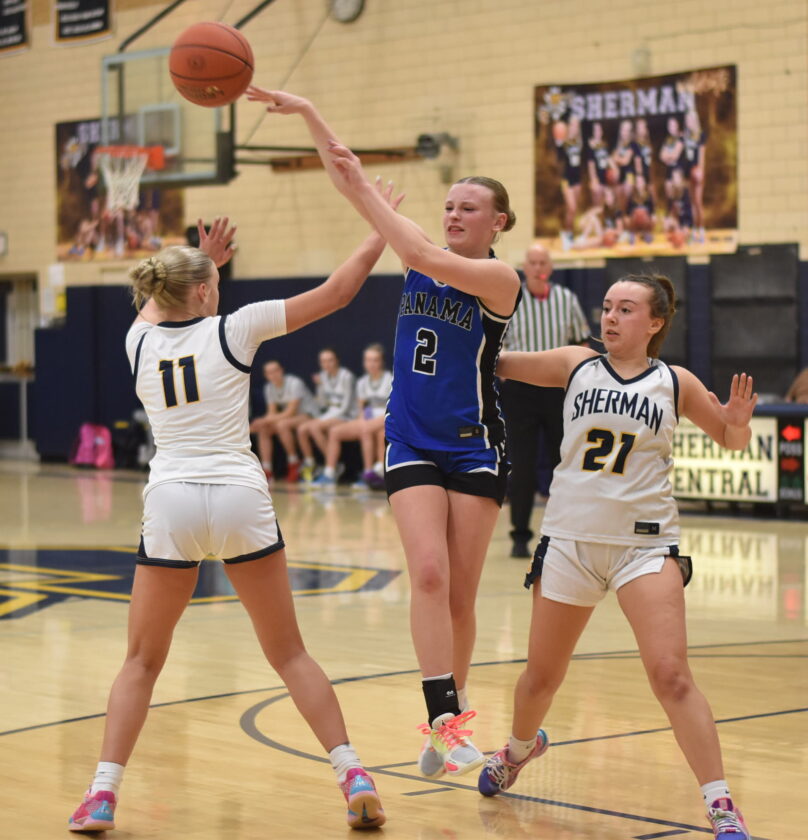 Panama’s Brooke Warner dishes a pass between Sherman defenders Emmersen Crawford, left, and Baya Oehlbeck during CCAA Division 2 girls basketball action in Sherman on Monday. P-J photo by Christian Storms