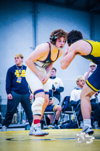 - Chautauqua Lake/Westfield/Panama/Clymer’s Gavin Burchanowski, left, battles Massapequa’s Jake Nieto during the NYSPHSAA Dual Meet Championships on Saturday at the SRC Arena and Events Center in Syracuse. Photo courtesy of Bradley Babcock | B.B_Visuals
