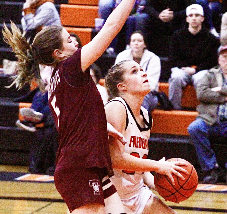Fredonia’s Cecelia Tonelli drives to the basket during Friday’s Section VI Class A2 prequarterfinal girls basketball game against Tonawanda. P-J photo by Braden Carmen