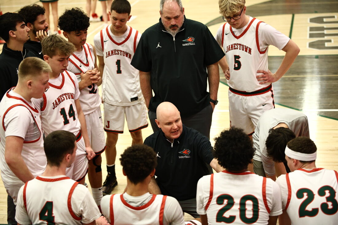 - Jamestown head coach Billy Miley speaks to his team during Tuesday’s nonleague basketball game against Williamsville South at McElrath Gymnasium. Photo courtesy of Steve Garvey