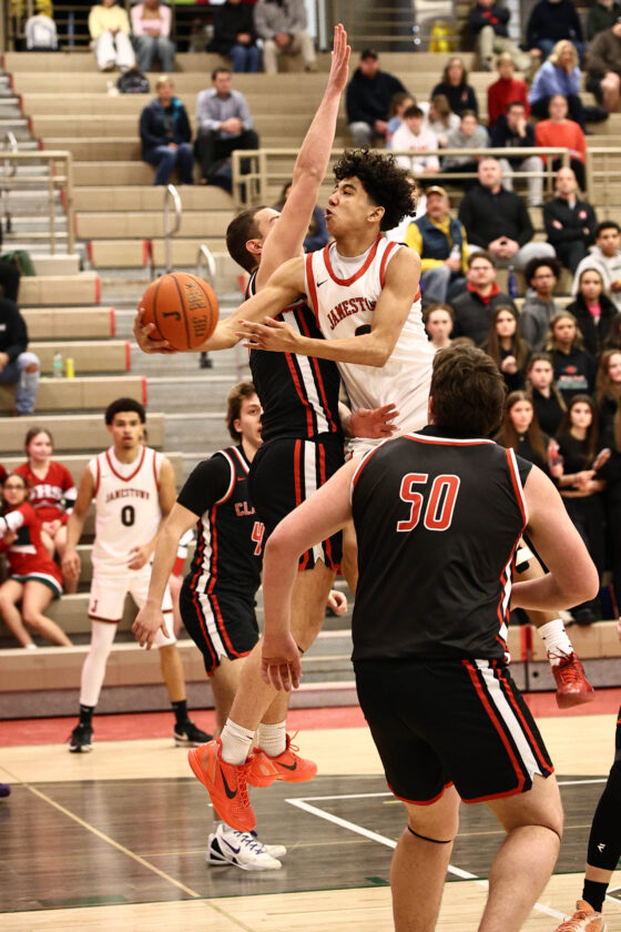 Jamestown’s Gavin Johnson goes past a Clarence defender for a layup in ECIC Division 1 action on Thursday at McElrath Gymnasium. Photo courtesy of Steve Garvey