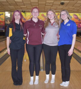 - Pictured are the tournament’s top bowlers, from left: Forestville’s Emily Lillie with the high handicap series of 702, Ellicottville’s Keira Baldwin with the high handicap game of 293, Dunkirk’s Chloe Sutton with the high scratch game of 255 and Hinsdale’s Rondeau with the high scratch series of 667. P-J photo by Christian Storms