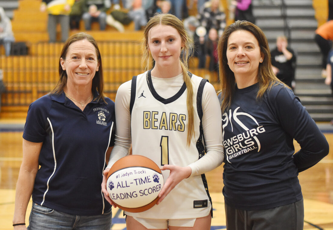 - Frewsburg’s Jadyn Trocki, center, broke the Frewsburg record for career scoring Saturday against Cathedral Prep. Pictured with Trocki are her mother, Sandy Ruhlman, at left, and Bears head coach Sierra Beaver, at right. P-J photo by Scott Kindberg