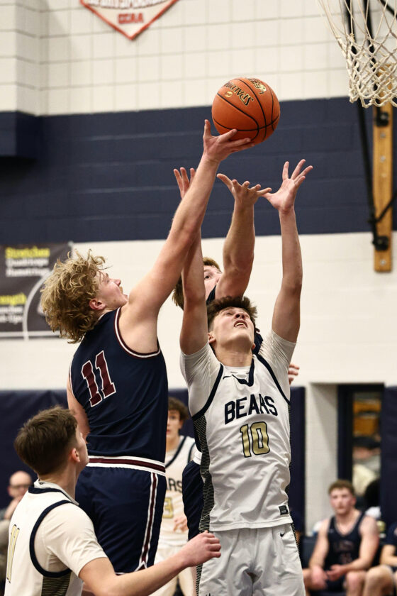 - Chautauqua Lake’s Asher Olson battles for a rebound over Frewsburg’s Drake Beckstrom during Tuesday’s Section VI Class C prequarterfinal in Frewsburg. Photo courtesy of Steve Garvey
