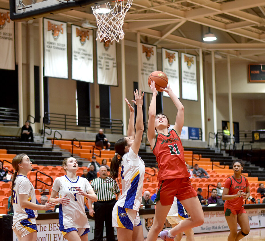 Jamestown’s Anna Engquist looks to score under the West Seneca basket during Thursday’s Section VI Class AAA girls basketball semifinal at Buffalo State University. P-J photo by Scott Kindberg