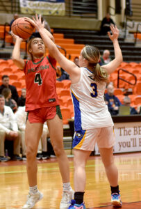 Jamestown’s Aiyann Stam looks to shoot over West Seneca’s Mel Marcezin during Thursday’s Section VI Class AAA girls basketball semifinal at Buffalo State University. P-J photo by Scott Kindberg
