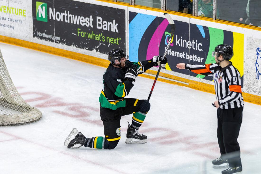 JCC captain Nate Stephens celebrates his hat-trick goal in the third period of Sunday’s game against Canisius at Northwest Arena. Photo courtesy of Alex Kolstee