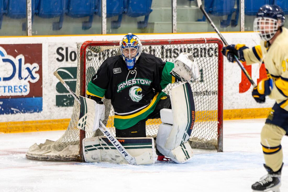 Jamestown Community College goaltender James-Anthony Roch goes down for a save during the first period of Sunday’s UNYCHL Division 3 championship game. Roch was named the tournament’s Most Valuable Player. Photo courtesy of Alex Kolstee