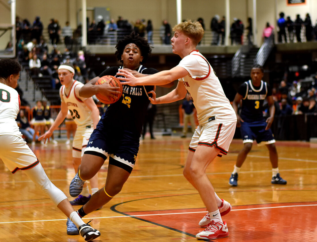 - Jamestown’s Karson Milne attempts to stop a drive to the basket by a Niagara Falls player during Thursday’s Section VI Class AAA boys basketball semifinal at Buffalo State University. P-J photo by Scott Kindberg