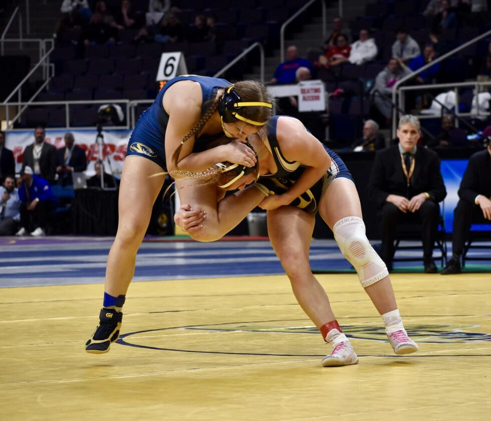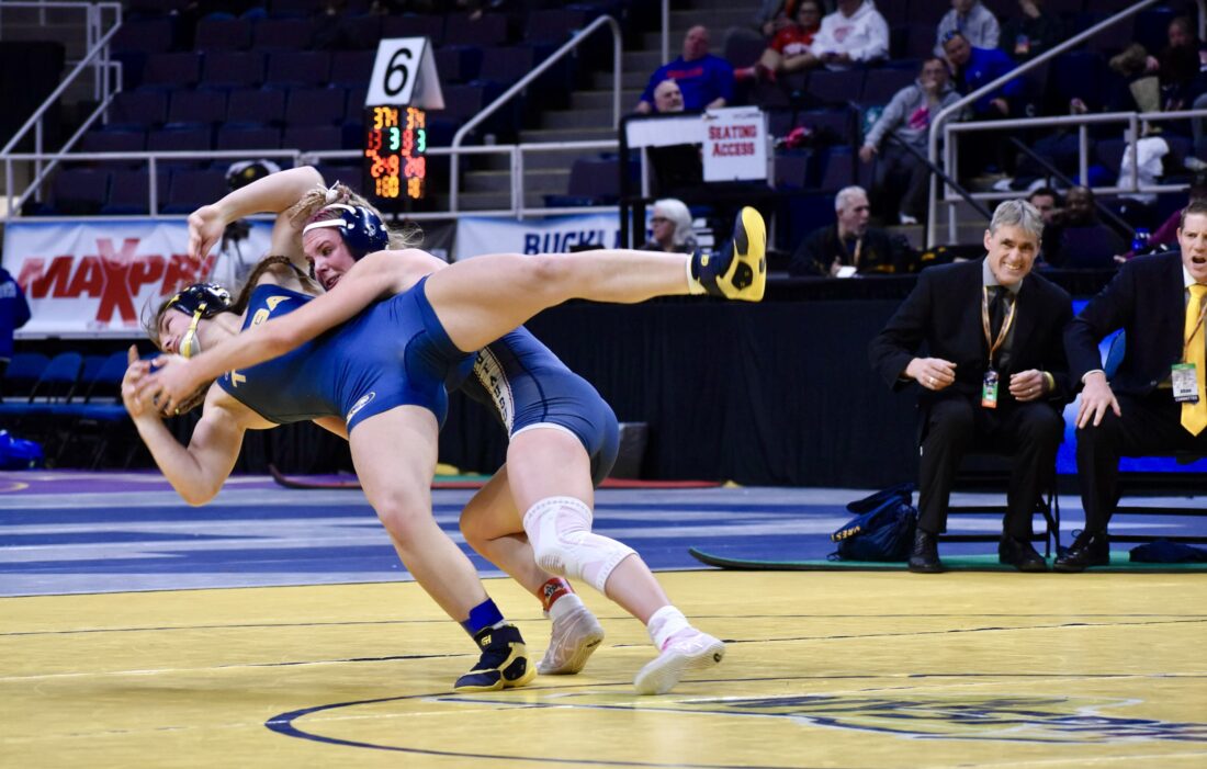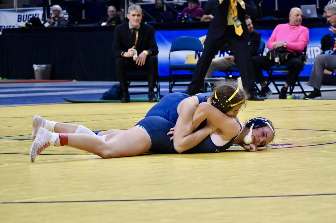 Paddock attempted to battle through and she escaped the first period leading 8-5, clearly being held back by her shoulder. Then, in the second period, Paddock looked to be back to normal, jumping to a 14-9 lead, but then Toomey did the same move that hurt Paddock earlier and this time there was no escaping as she secured the pin and claimed the state title at 4:58.