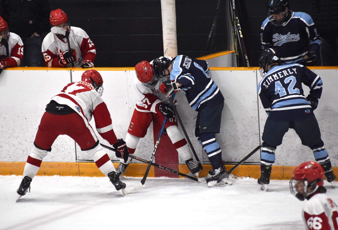 - Jamestown’s Ture Fagerstrom, left, and Dunkirk/Fredonia’s Ryan Wegrzynowski, right, battle along the boards as their teammates Ty Barron, left, and Caleb Kimmerly, right, provide defensive support in Game 2 of a Western New York High School Club Hockey League Mixed School Division playoff game at Northwest Arena in Jamestown on Thursday. P-J photo by Christian Storms