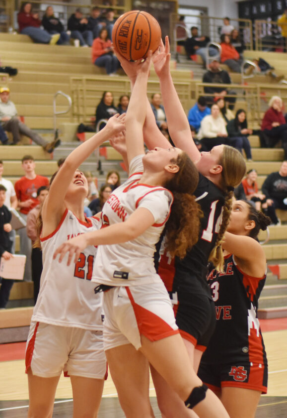 Jamestown’s Anna Engquist (21) and Payton Gibbs battle Maple Grove’s Meg Ryan (14) and Bry Cornell (13) for a rebound during Wednesday’s nonleague girls basketball game at McElrath Gymnasium in Jamestown. P-J photo by Scott Kindberg