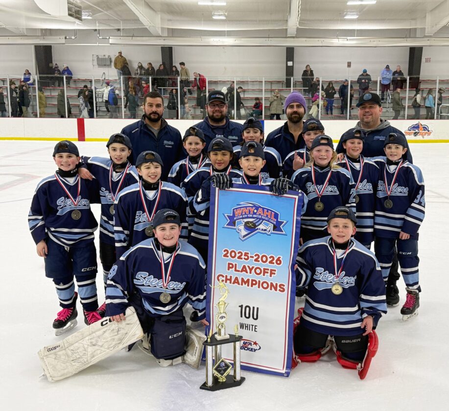 The Fredonia Steelers 10U travel team captured the 2025-26 Western New York Amateur Hockey League 10U White Division championship on Saturday at Cheektowaga Town Ice Rink with a thrilling 1-0 overtime victory against Hamburg Hawks 10U. The championship-winning, overtime goal was scored by Karter Bender. Team members are: Dominik Betts, Wyatt Pacanowski, Bryce Potter, Dominic Salemi, Ronan Brenecki, Grady Jimerson, Carmine Malkowski, Piper Kane, Troy Whippo, Karter Bender, Griffin Hyldahl, Carter Hennessey and Trenton Farnsworth. Coaches are: Kevin Salemi, Dave Hennessey, Jake Hyldahl and Jeff Potter.