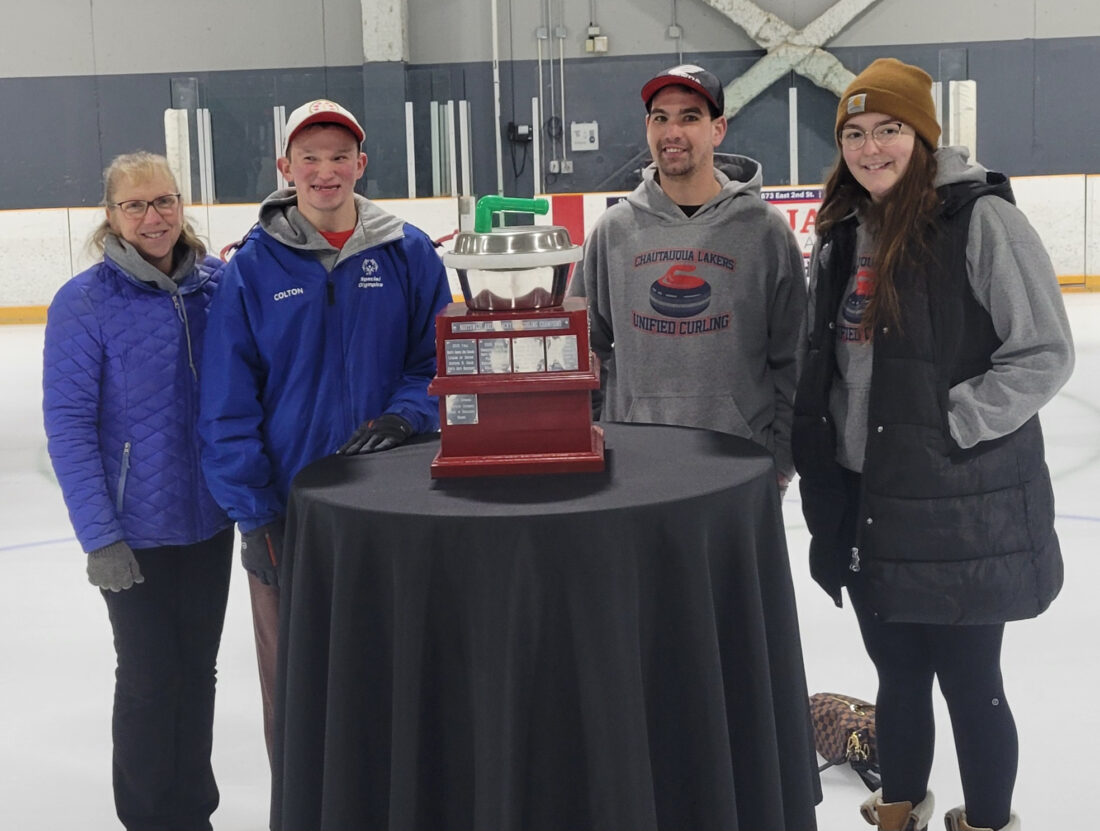 Sweeping Beauties captured the Collaborative Children’s Solution Special Olympic Unified Curling League championship at Northwest Arena, as they defeated the Rock Stars 28-20 in the championship game. Pictured, from left, are: Barb Hanson, Colton Hanson, Tyler Cain and Courtney Swanson. Submitted photo