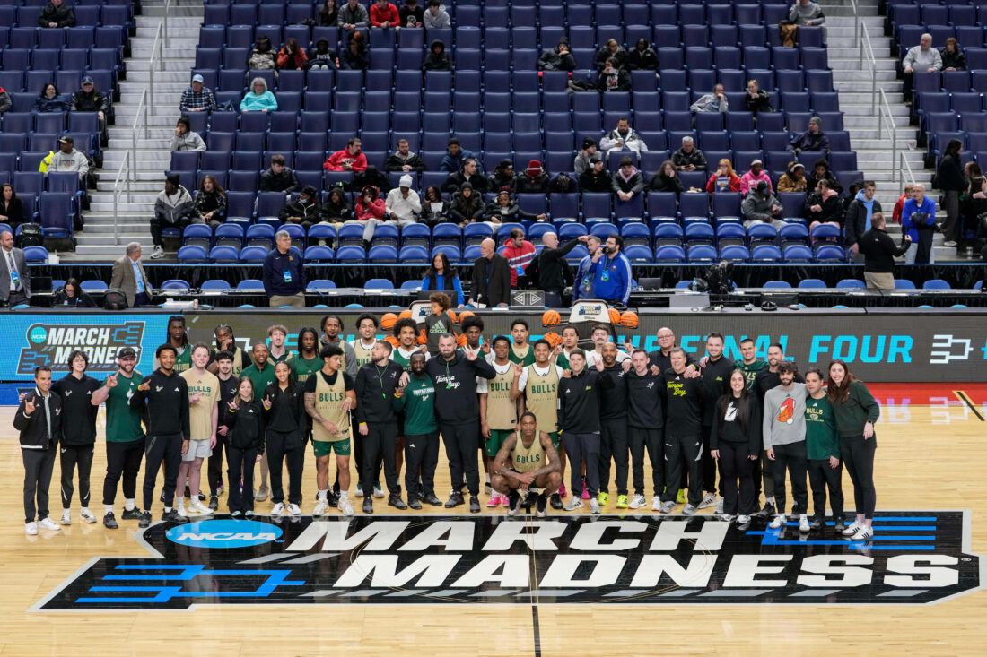 - Members of the University of South Florida basketball program pose for a picture during the Bulls’ practice period at KeyBank Center in Buffalo on Wednesday. AP photo