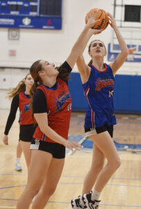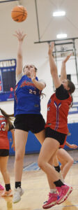 - Frewsburg’s Abery Harvey floats a shot past Westfield’s Arielle Corbett. P-J photo by Matt Spielman
