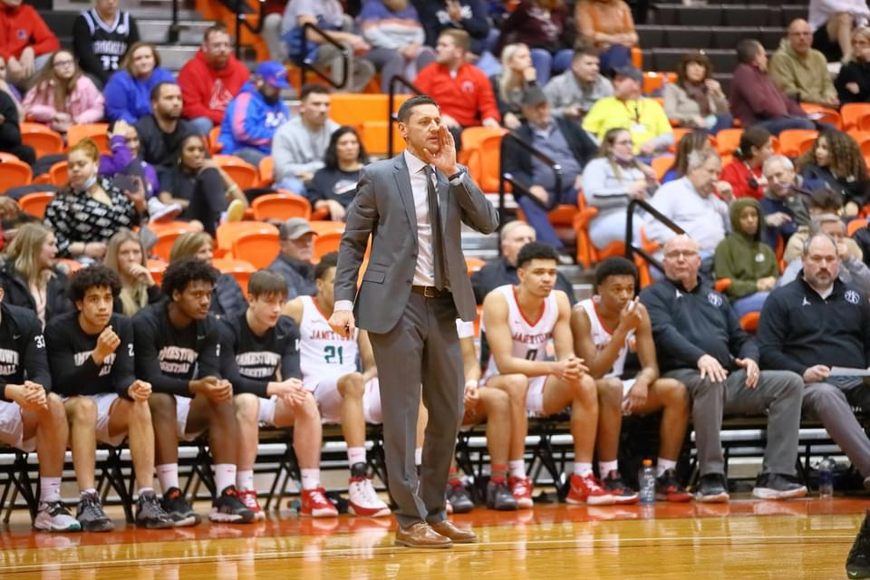 In this March 2022 file photo, Jamestown boys basketball coach Ben Drake gives instructions to his players during a Section VI playoff game at Buffalo State Sports Arena. P-J file photo