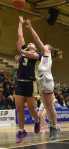 - Frewsburg’s Abery Harvey puts up a shot over a Delaware Academy defender during a NYSPHSAA Class C semifinal Friday at Hudson Valley Community College in Troy. P-J photo by Matt Spielman