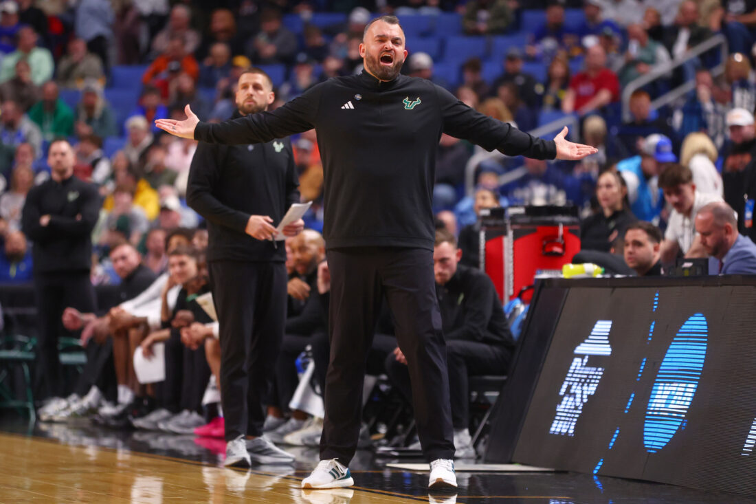 South Florida head coach Bryan Hodgson reacts during the first half of an NCAA basketball tournament first-round game against Louisville last Thursday in Buffalo. AP photo