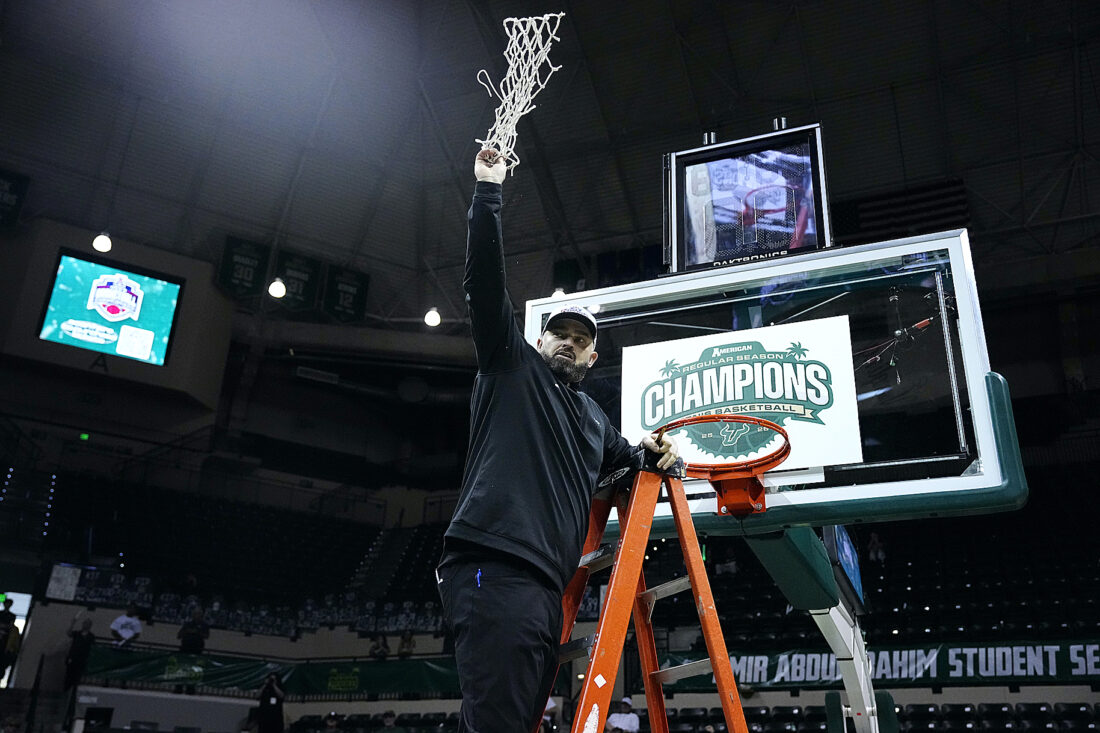 - University of South Florida men’s basketball coach Bryan Hodgson cuts down the nets at Legacy Arena. Photo courtesy of University of South Florida Athletics