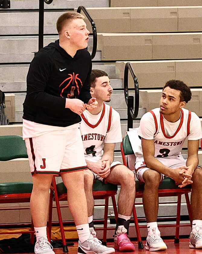 Jamestown senior Kameron Milne will stand more than he sits on the bench during today’s NYSPHSAA Class AAA Far West Regional against Fairport at the Buffalo State Sports Arena. P-J photo by Scott Kindberg