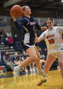 - Southwestern’s Braya Beaver attempts to make a pass as Waterloo’s Delaney Battin defends P-J photo by Matt Spielman