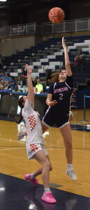 - Southwestern’s Gianna Sirianni flips up a shot over a Waterloo defender during a NYSPHSAA Class B subregional playoff game at Gates Chili High School on Wednesday. P-J photo by Matt Spielman