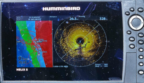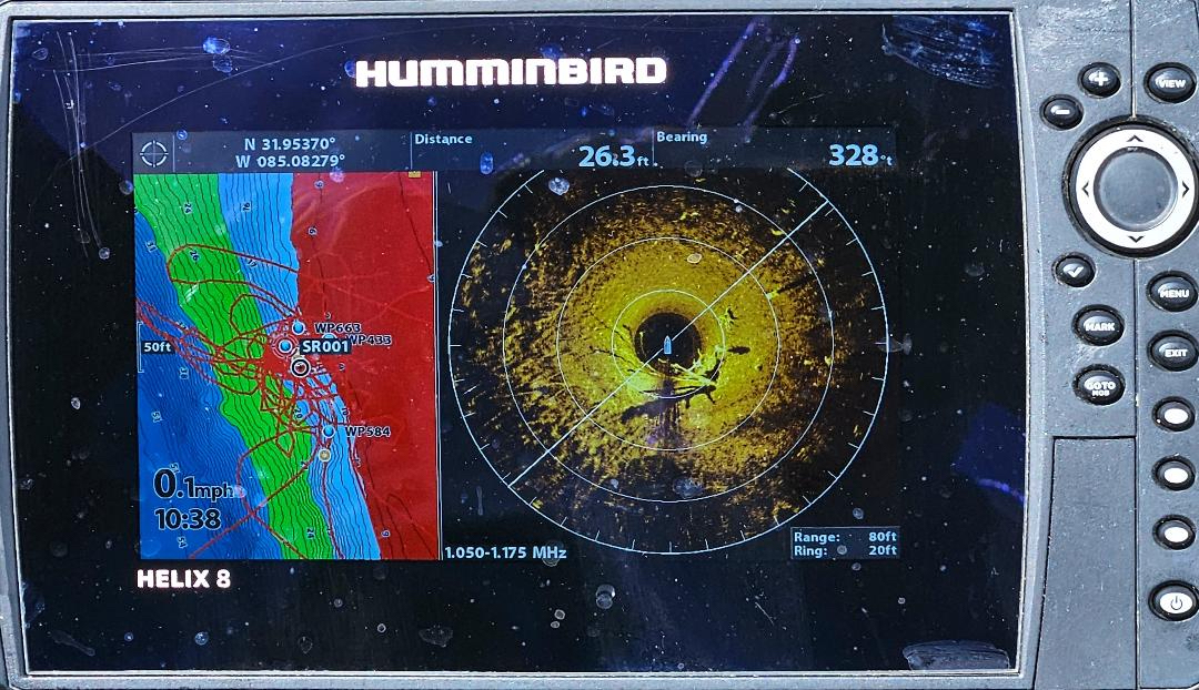 New Hummingbird forward-facing sonar units allow 360-degree viewing. In this example on the right, each ring is 20 feet apart, and the range setting is for a total look of 80 feet away all around the boat. The tree structure is noted, and the individual blips are crappie. Photo courtesy of Forrest Fisher
