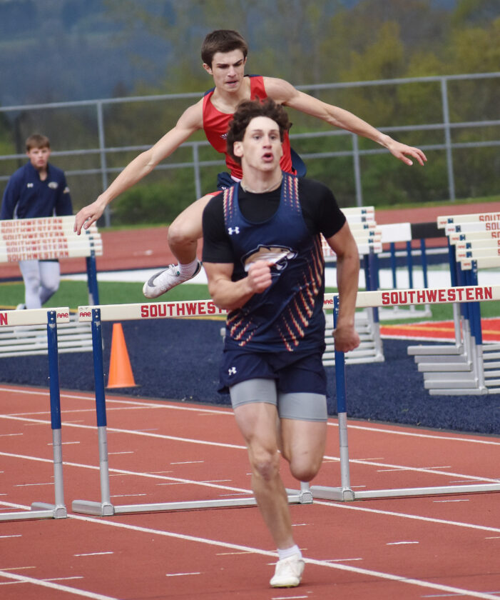- Falconer/Cassadaga Valley’s Reese McKay, front, and Southwestern’s Kellan Brown compete in the 400-meter intermediate hurdles in Chautauqua-Cattaraugus Athletic Association Division 1 boys track and field action at the Sirianni Athletic Complex on Tuesday. P-J photo by Scott Kindberg