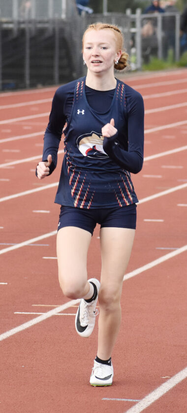 - Falconer/Cassadaga Valley’s Alicyn Debo finishes the 800 meters. P-J photo by Scott Kindberg