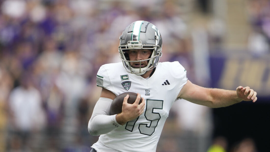 2019 Southwestern graduate Cole Snyder is pictured competing for NCAA Division I program Eastern Michigan University. Snyder launched Chalk Talk following the CFL season last year with the Edmonton Elks. AP file photo