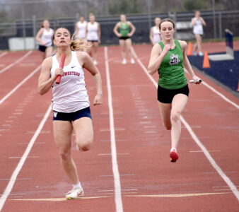 - Southwestern’s Avery Johnson beats Clymer/Sherman/Panama’s Olivia Dellamora to the finish line in the 400-meter relay during Tuesday’s nonleague track and field meet at the Fran Sirianni Athletic Complex. P-J photo by Matt Spielman