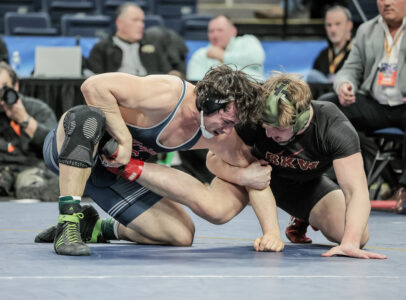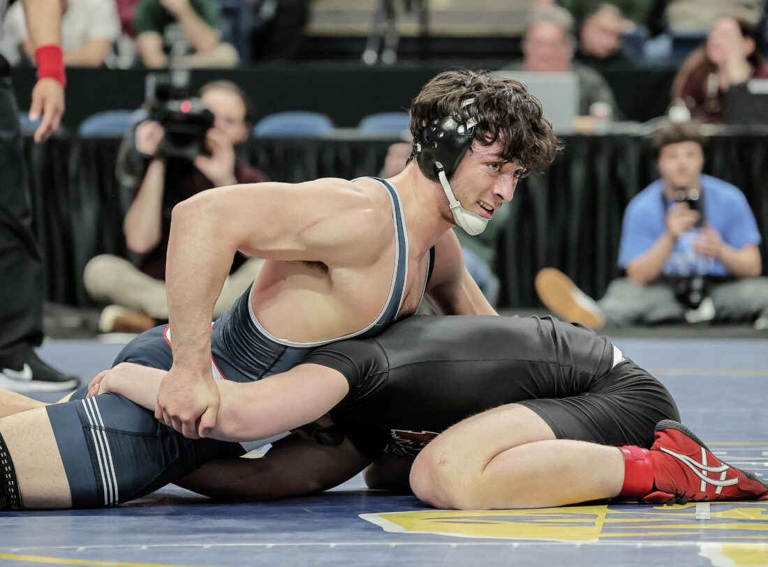 With English avoiding contact, Hoose inched closer earning another point from stalling, but he still needed to score with just 30 seconds left. After that he made his move, with English scrambling hoping to escape Hoose’s grip, the Southwestern senior completed the storybook ending by securing the takedown to capture the 190-pound state championship with a 6-4 decision, going out as he came in — a state champion.