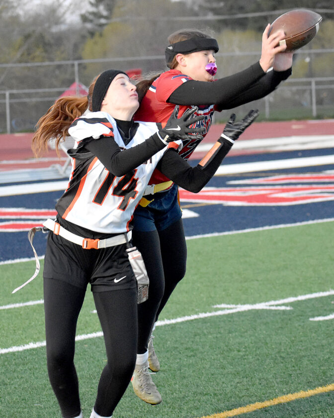 - Southwestern/Frewsburg’s Jaden Jimerson, right, breaks up a pass intended for Fredonia’s Madelyn Polhamus during Monday’s Section VI Division 4 flag football game at the Sirianni Athletic Complex. P-J photo by Matt Spielman