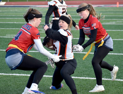 - Fredonia’s Emma Perry, middle, is surrounded by Southwestern/Frewsburg defenders Elyse Gruber and Rozlyn Haglund during Monday’s Section VI Division 4 flag football game at the Sirianni Athletic Complex. P-J photo by Matt Spielman