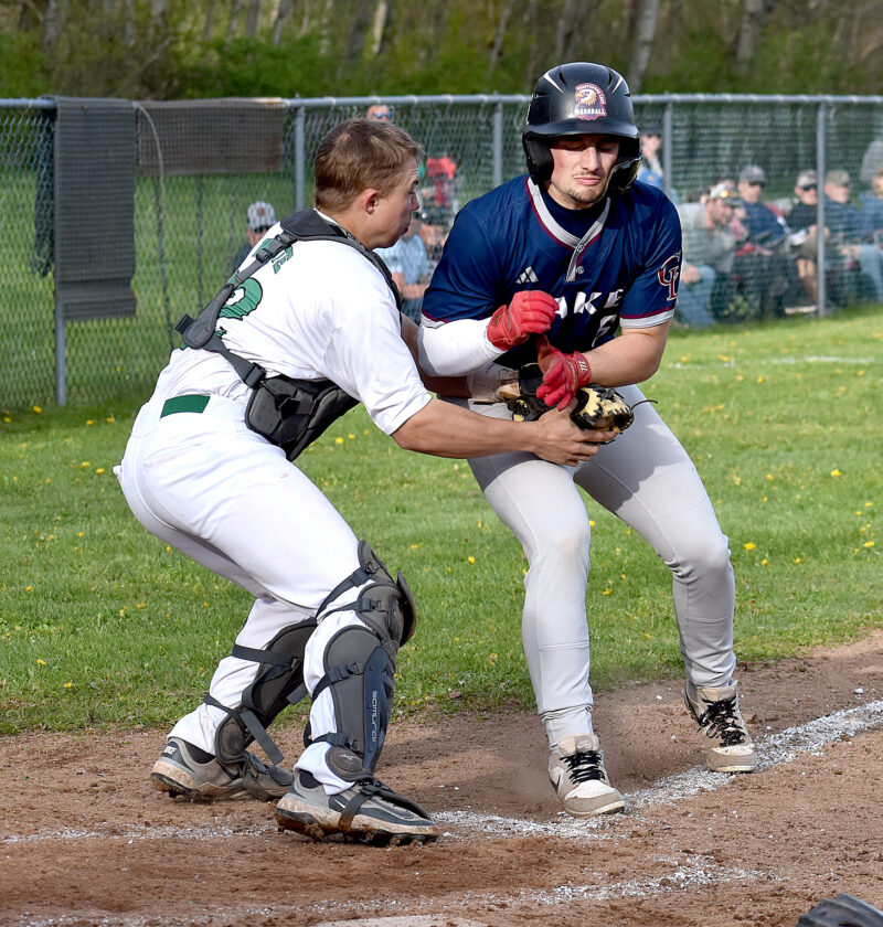 - Clymer/Sherman/Panama’s Max White tags out Chautauqua Lake’s Greyson Wellman attempting to score during Monday’s CCAA Division 2 game in Panama. P-J photo by Matt Spielman