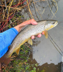 - For folks with experience after a rainstorm, certain inland streams remain fishable. This nice brown trout was one of twice the daily limit caught and released in Allegany County. Salted minnows worked well. Photo courtesy of Jim Drozdowski Jr.