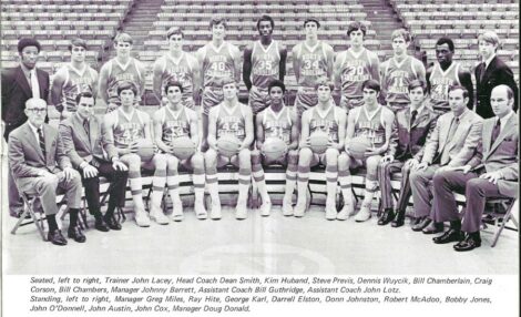 - Donn Johnston, center, is seen with teammate George Karl (22) and North Carolina coach Dean Smith in a photo taken for the Tar Heels’ 1972-73 media guide. Photo courtesy of the Chautauqua Sports Hall of Fame