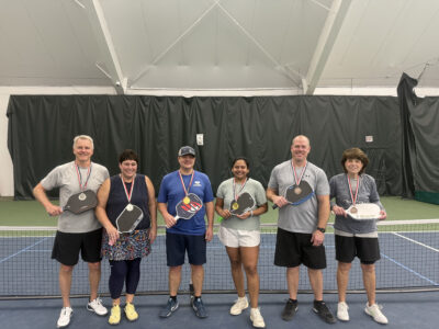 - From left, in the 4.0+ Division are: Mark Dalgish and Marlene Sandberg, second place; Todd Hendricks and Kaveeya Tamizh, first place; and Gary Doolittle and Michele Ognibene, third place.