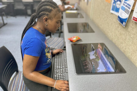 Oryanan Lewis works in the computer lab at Chattahoochee Valley Community College in Phenix City, Ala., on Feb. 23, 2023. She has an autoimmune disease and nearly had to drop out of community college due to sickness, but, through support, got back on track and is now finishing her second year of a medical assisting degree. AP photos